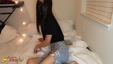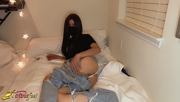 Horny brunette transexual Dawn Rivera posing her sexy feet while masturbating in the bedroom